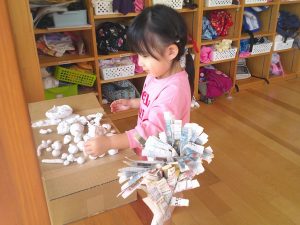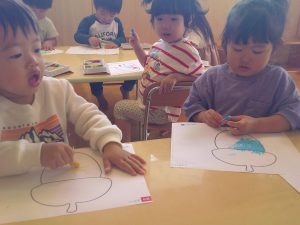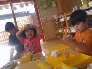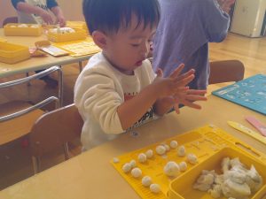 ねんど遊びでは、みんなコロコロ・・・上手に丸めて、何を作っているのかな?