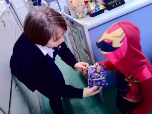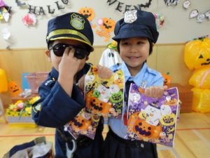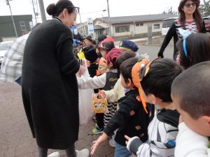 合言葉を伝えて、お菓子をもらい満面の笑顔😊😊の子ども達。