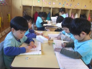 ワークでは、姿勢に気を付けながら一文字ずつ丁寧に書き進めていますね✏