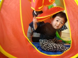 友達と一緒にテントに入り「いないいないばあ!」と可愛らしい顔を覗かせていました💞