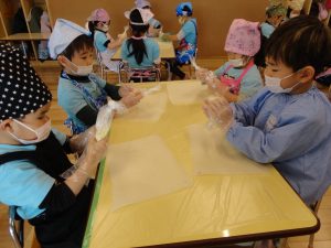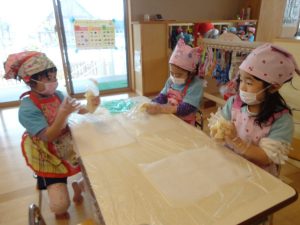 生地をこねたり、伸ばしたりと生地を作りました。