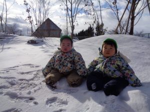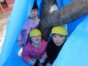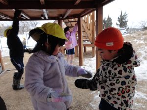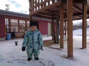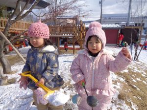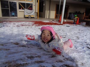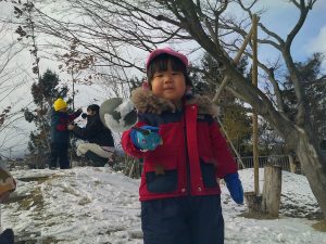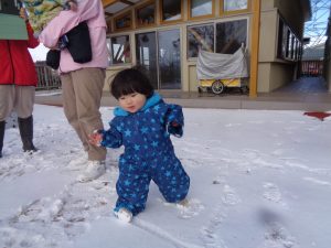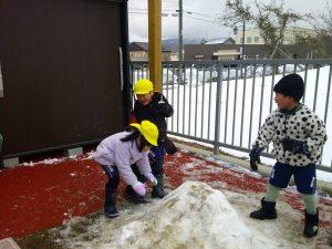 そして、園庭に少し雪が積もり、今日は晴れ空の中、雪遊びも楽しむことが出来ました🎵