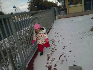 真っ白に染まった園庭が不思議なようです😊🍀
