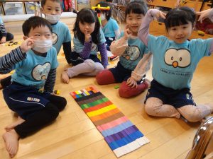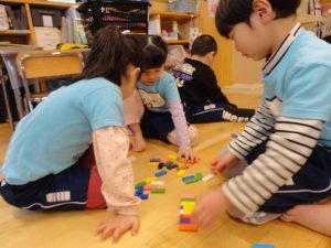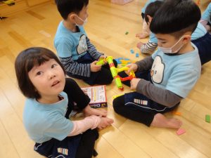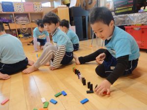 ドミノは、色ごとに揃えたり、並べたり、積み上げてお化け屋敷を作っている子もいました👻