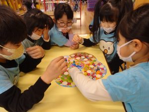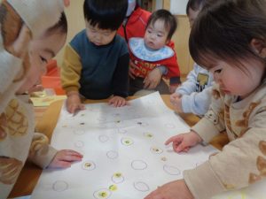 丸の中にシールを貼ったりもしました!丸の中にシールを貼る時、とても真剣に貼っていました👏