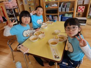 今日の給食は、大好きな”とん汁”にとっても嬉しそうでした😊
