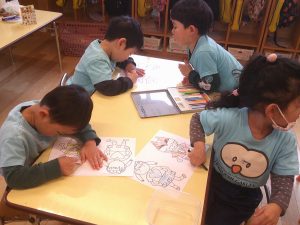 「何色にしようかな?」次から次へと色をかえて、カラフルな塗り絵を楽しみました🌈