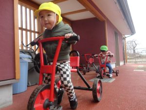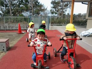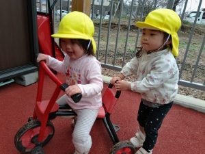 園庭散策ではお散歩ごっこ遊びをするお友だちや三輪車で車ごっこ遊び🚗“渋滞で~すよ😄”
