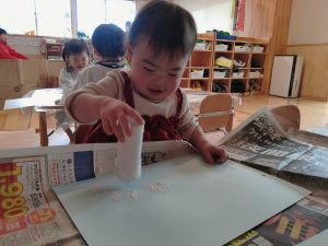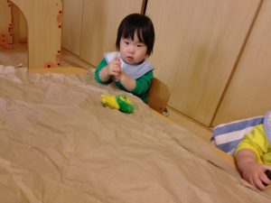 朝の会後、テーブルに大きな紙を広げて、お手てでニギニギ・カシャカシャして遊びました🌟