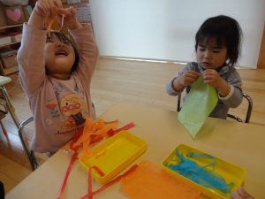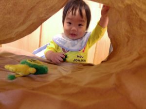 紙の下におもちゃを隠して宝探しをしたり、紙のトンネルで「いないいないばあっ!」をして盛り上がりました👏