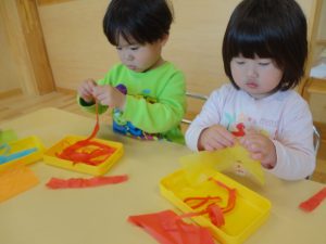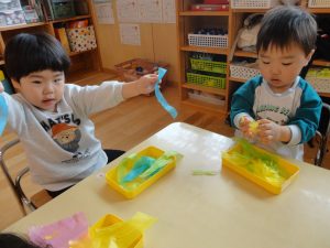 カラフルなお花紙をビリビリ。 指先をたくさん使って集中して取り組んでいました👆